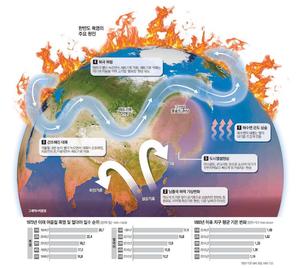 올여름 중위도 지역 상공에 부는 강한 바람인 제트기류가 약해지면서 공기의 순환이 느려졌고, 이에 따라 특정 지역에 고기압이 오랫동안 정체되는 상황이 발생했기 때문이다. WMO의 기후 전문가인 알바로 실바는 “제트기류가 약해진 조건에서는 거의 고정된 날씨 패턴이 형성돼 일부 지역에서는 장기간의 폭염과 가뭄이 발생하고 다른 지역에서는 폭우가 내린다”고 말했다. 전지구적인 온난화 추세와 올여름 강하게 발달 중인 엘니뇨 현상이 폭염의 강도를 높이는 데 영향을 미쳤다는 해석도 있다.
