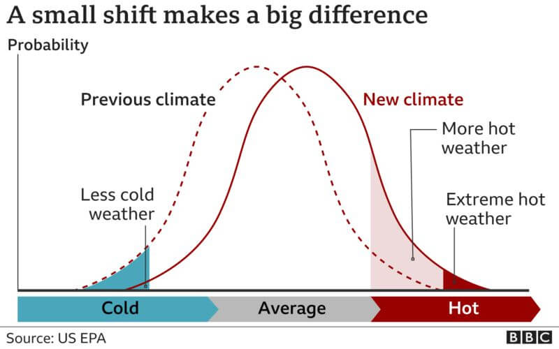 위의 그림에서 보는 바와 같이 기후(평균적인 기상의 변화)가 변하고 있다, 지구온난화로 인해 날씨가 더워지는 평균의 축이 오른쪽으로 이동하고 있다. 이렇게 되면 발생하는 일례로 ‘세계기상원인규명네트워크(WWA)’에 따르면 지난 4월 스페인, 포르투갈, 아프리카 북서부에서 관측된 기록적인 폭염의 발생 가능성은 기후 변화로 인해 최소 100배 이상 커졌다고 한다.
