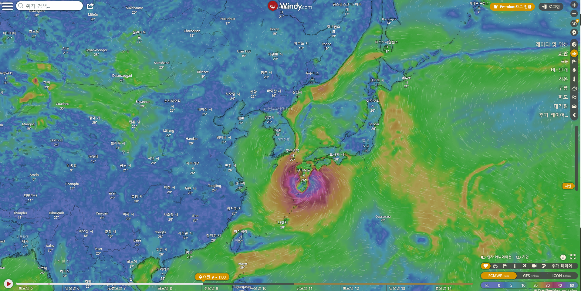 1. 8월 9일 수요일 오전 1시경에 우리나라에 영향을 미치기 시작하는 걸로 보입니다.