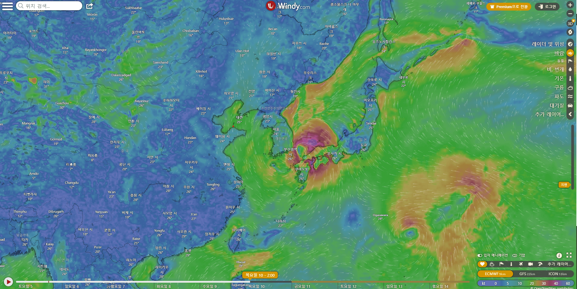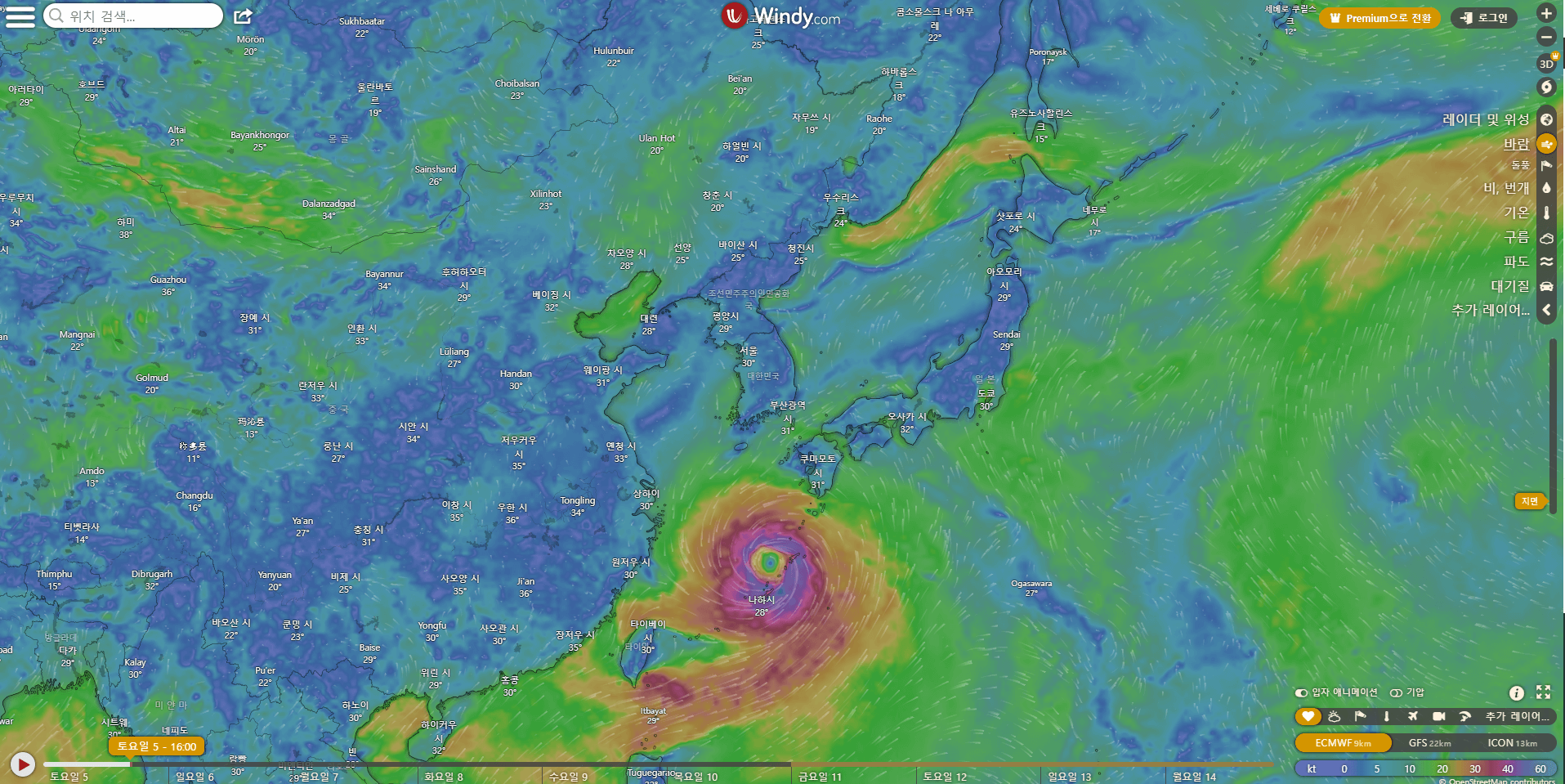 윈디라는 사이트는 이렇듯 시간에 따른 태풍의 예상경로를 확인하기에 꽤 적절한 정보를 제공하여 줍니다.