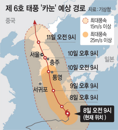 제6호 태풍 ‘카눈(KHANUN)’이 9일부터 경남 해안에 영향을 미치기 시작해 10일 오전 경남 통영으로 상륙해 이날 오후 수도권을 직격할 것으로 예보됐다.