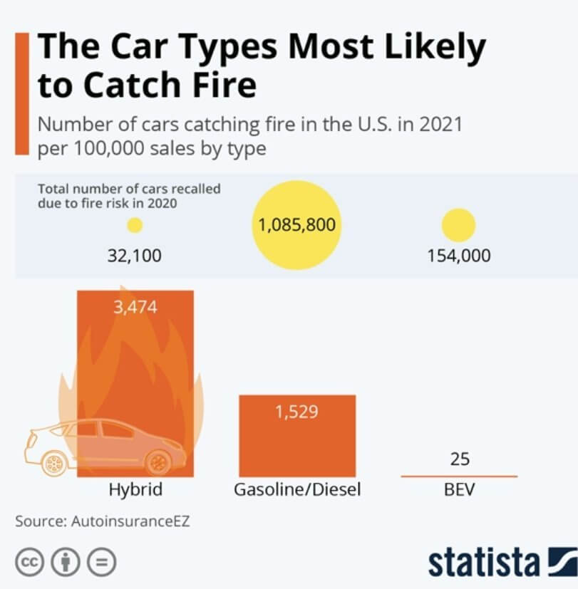 3위 EV(전기차) 2021년 판매된 10만 대 당 시 단 25건의 화재가 발생